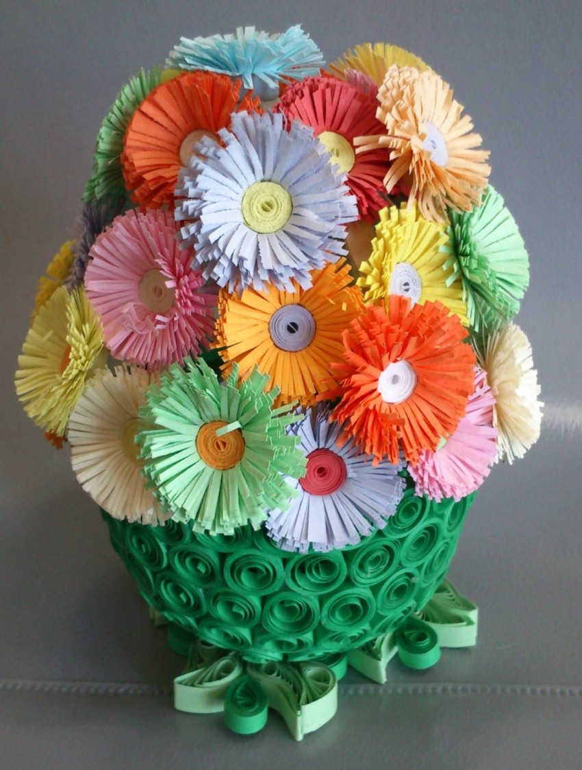 Такая поделка особенно понравится девочкам. Корзинка с бахромой всегда выглядит ярко и празднично. Ее можно сделать из коротких отрезков, которые потребуется склеить между собой.
