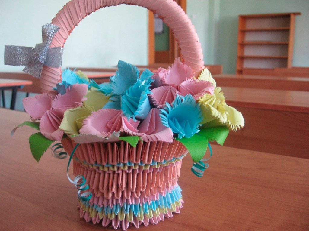 С самого детства дети учатся создавать разнообразные фигуры в этой технике. Но помимо цветов, животных и птиц из бумаги можно сделать красивую корзинку. Такая поделка не подходит для хранения вещей, однако, станет прекрасным украшением интерьера.