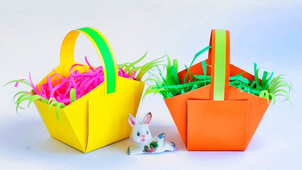 Это одна из самых простых поделок, с которой справится каждый ребенок. Для этого необходимо вырезать большой квадрат, сложить его стороны и склеиться между собой. Но чтобы корзинка не выглядела слишком простой, ее можно украсить по своему вкусу.