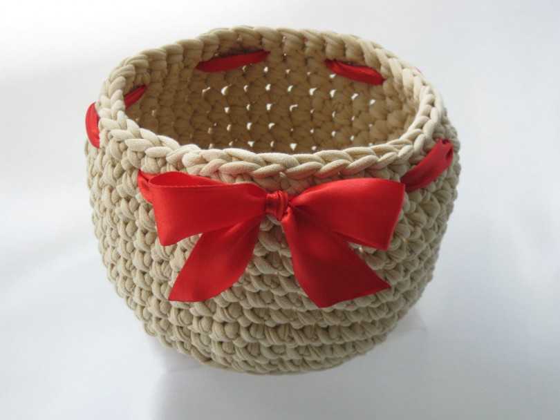 Необычно выглядит корзина из толстой пряжи, связанная крючком.