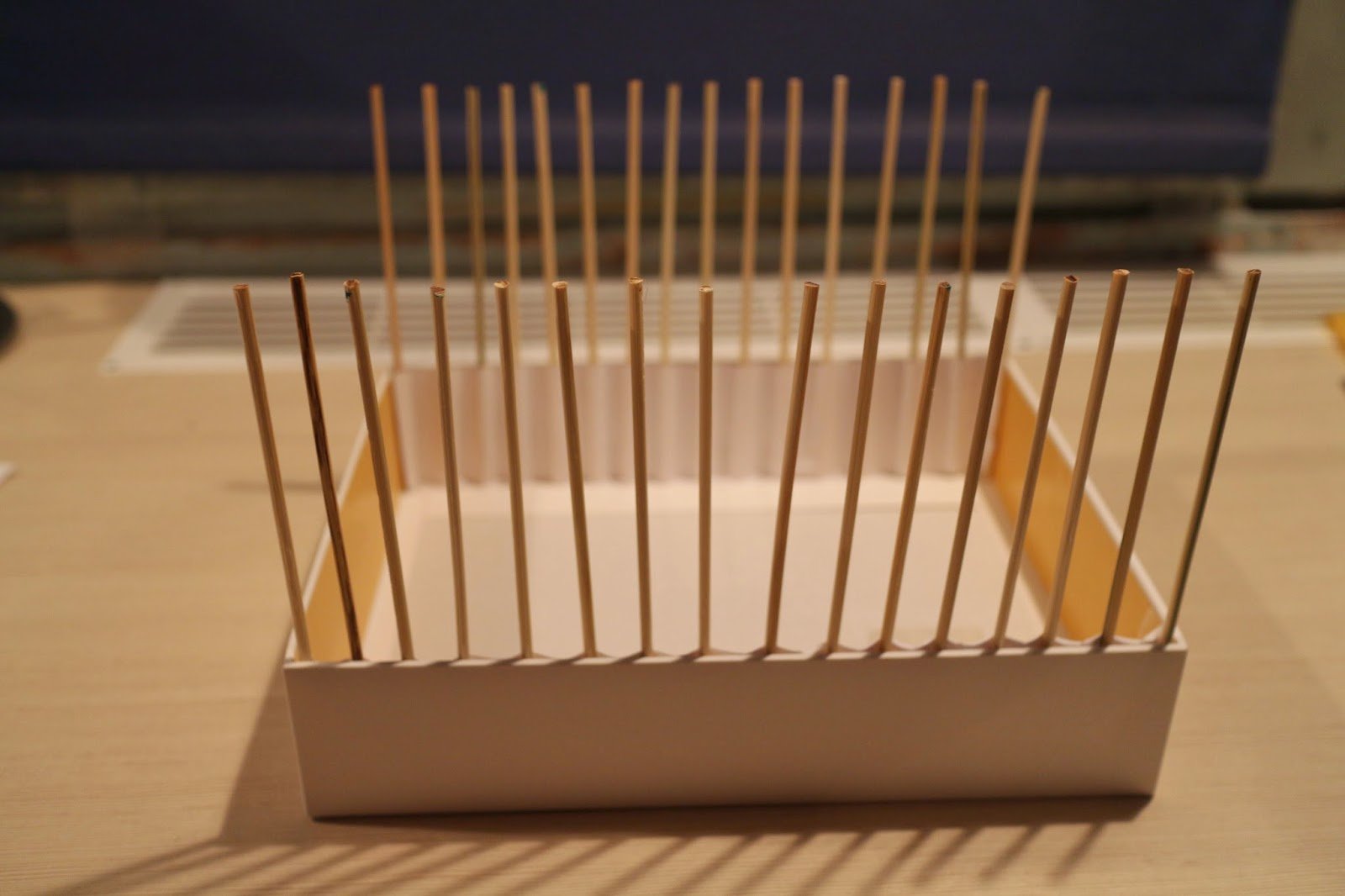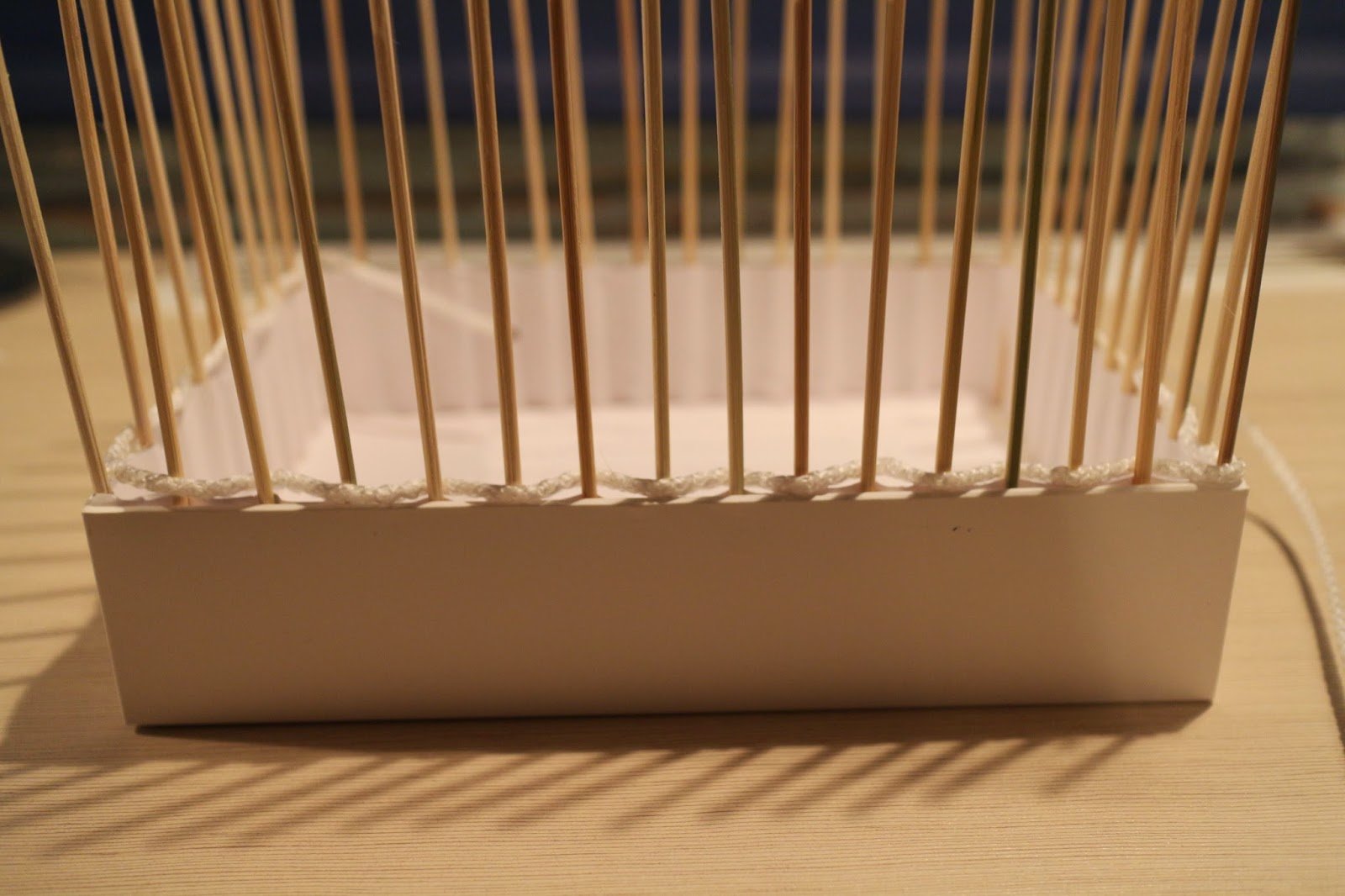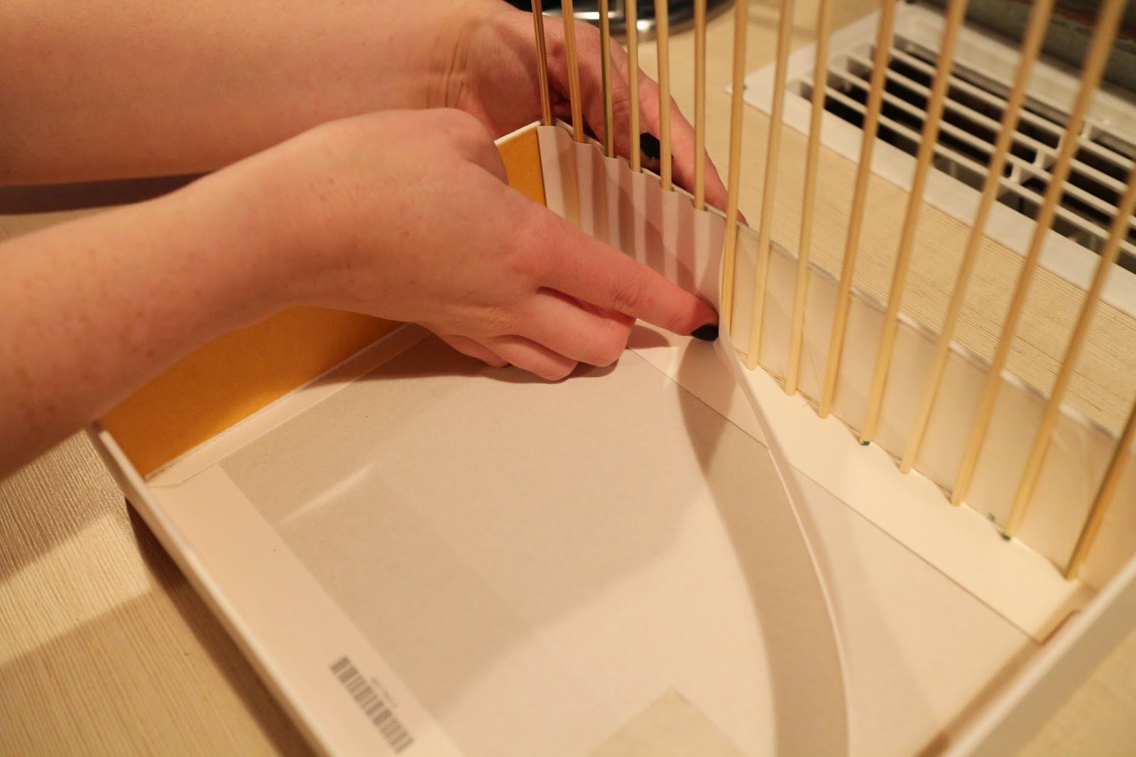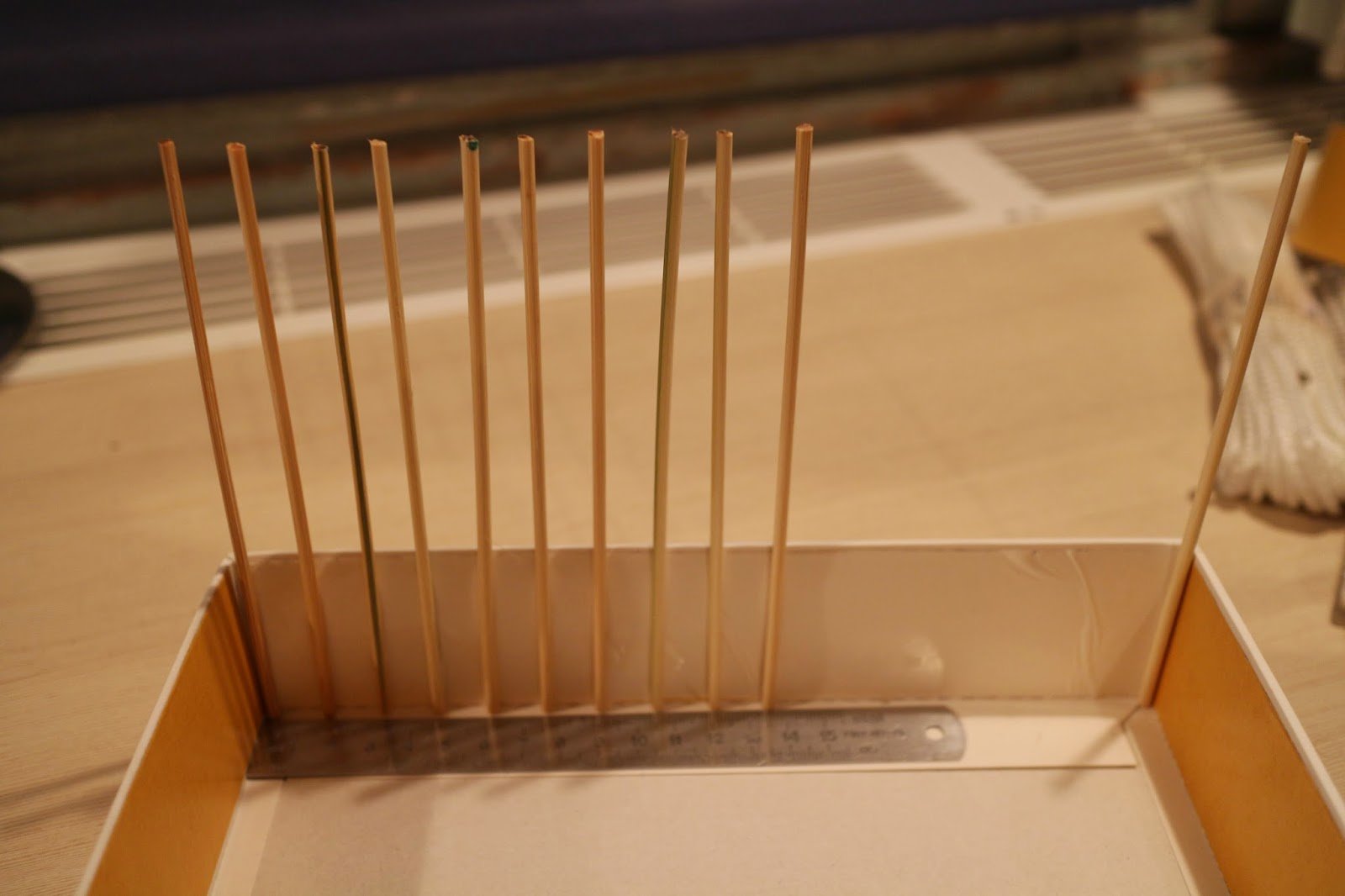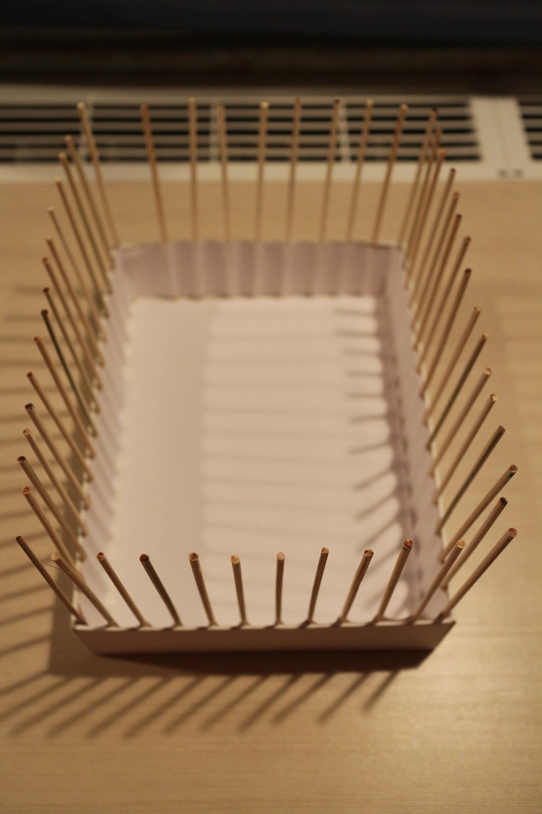 Когда одна стенка будет готова, поверх шпажек приклеиваем еще один отрезок скотча.