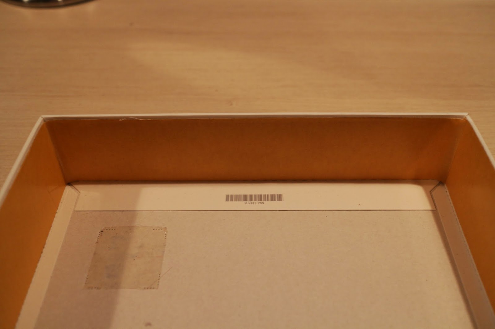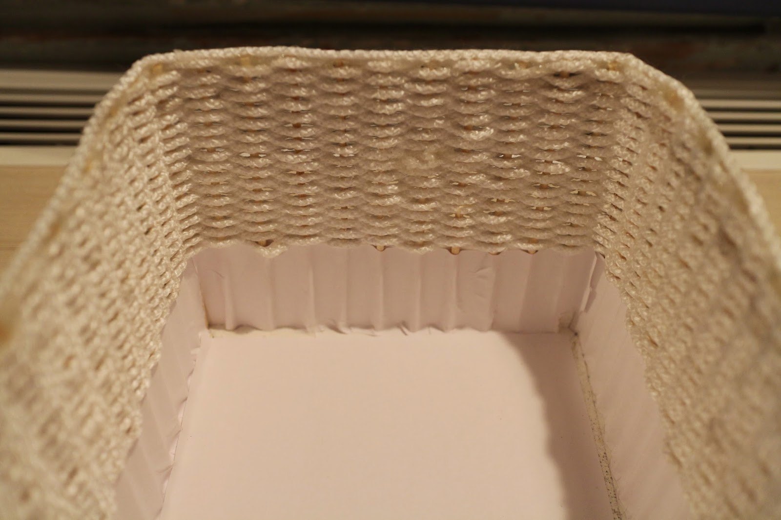 Приступаем к оформлению основания корзинки. Немного срезаем углы картонной коробки. Это нужно для того, чтобы они были скругленными.
