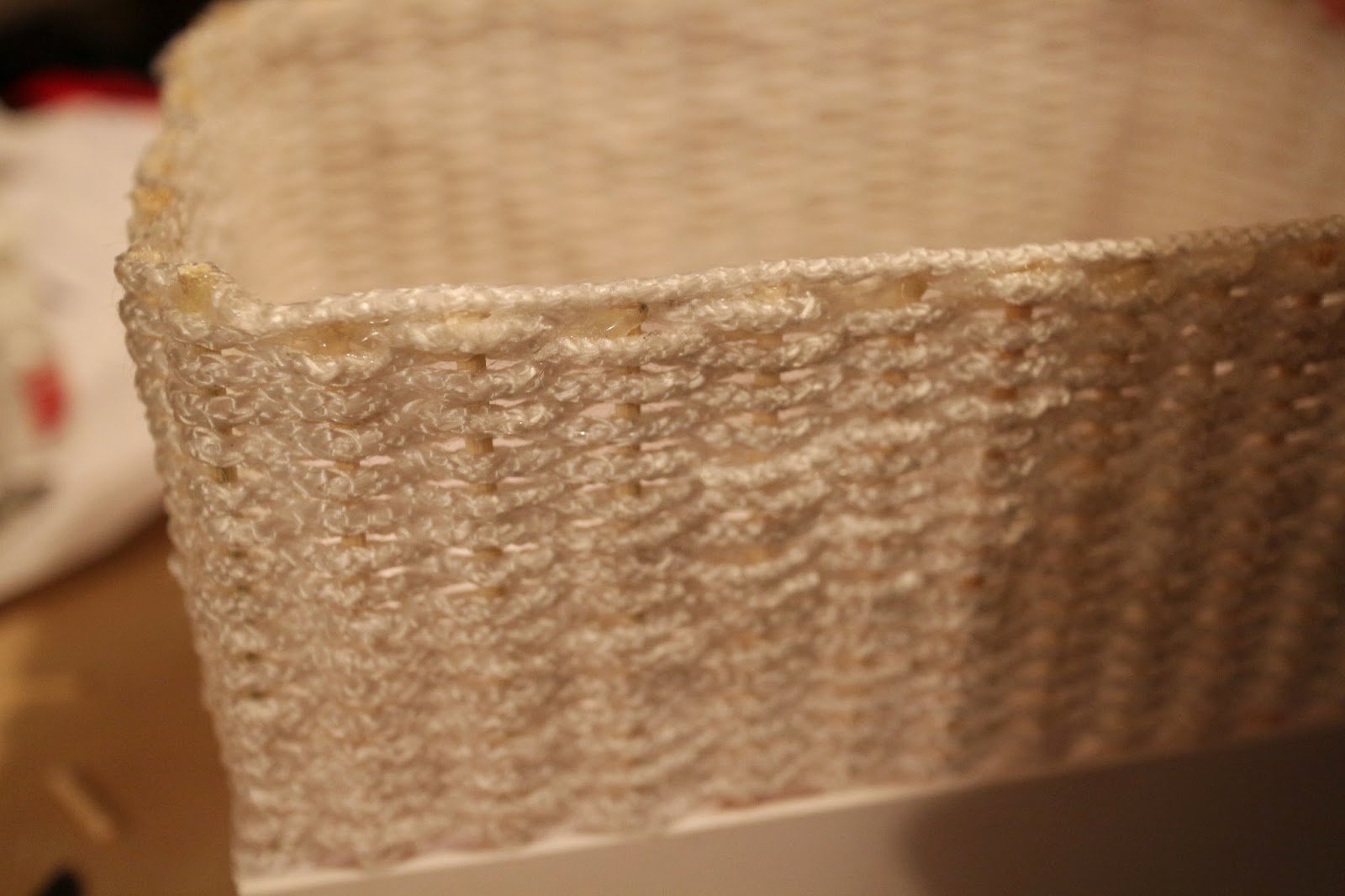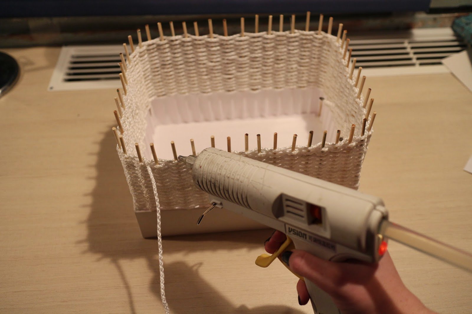 Обматываем корзинку нитью по периметру и для надежности периодически фиксируем ее горячим клеем.