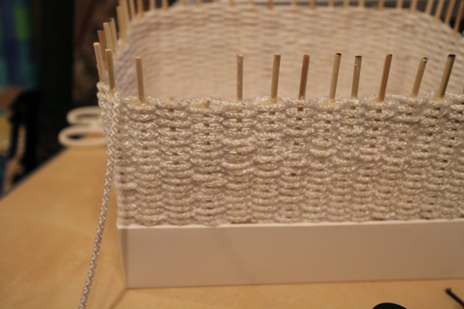 Затем перестаем делать прибавления петель и вязание автоматически идет вверх до нужной длины корзинки.