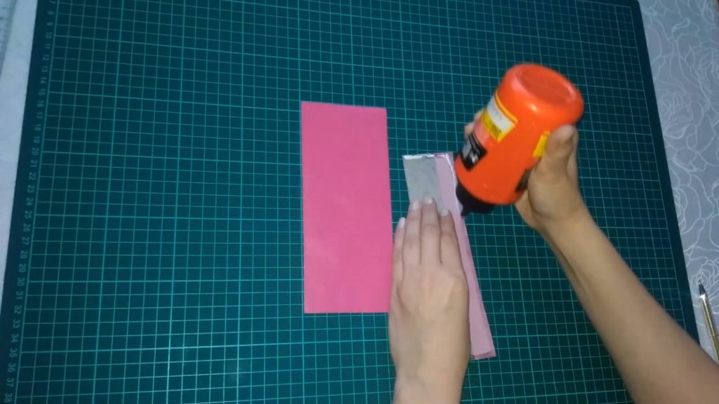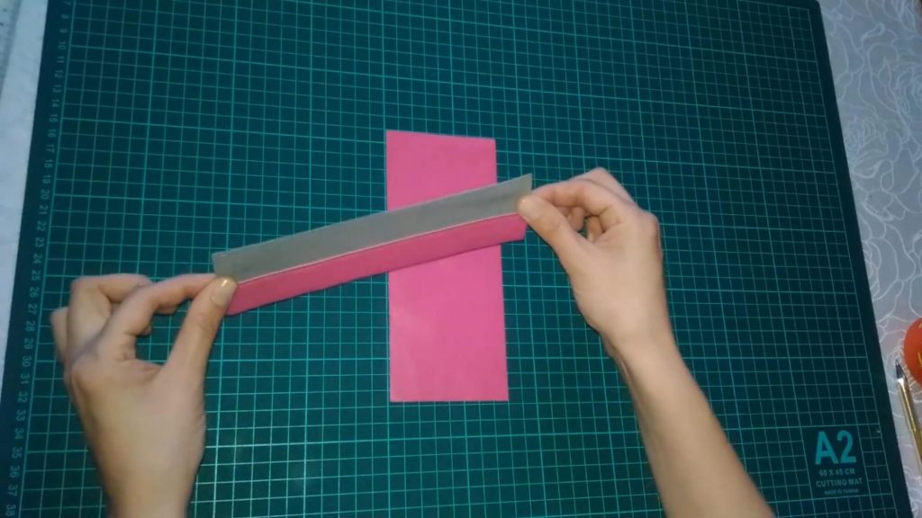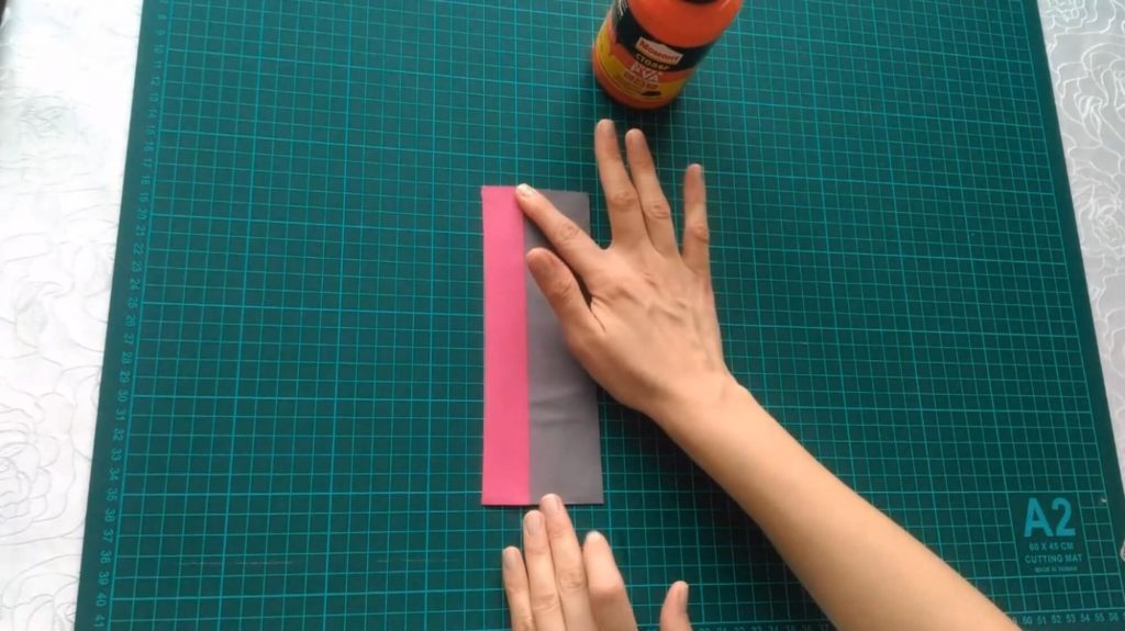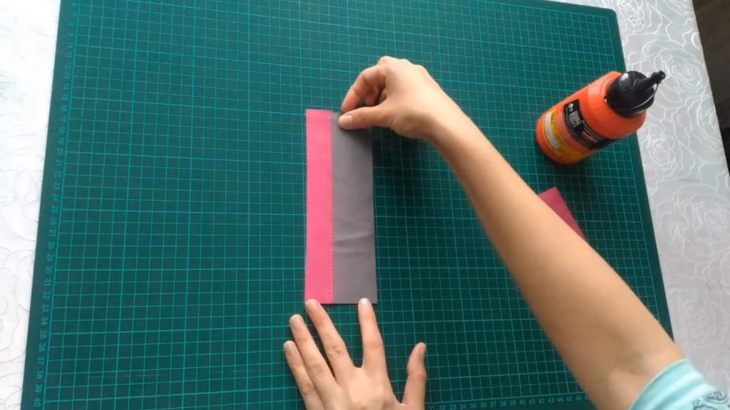 Берём 2 детали: серую, шириной 4,5 см. и розовую – 2,5 см. Отмеряем от края серой полоски 3-4 мм., проводим линию клеем и накладываем на неё “внахлёст” розовую полоску.