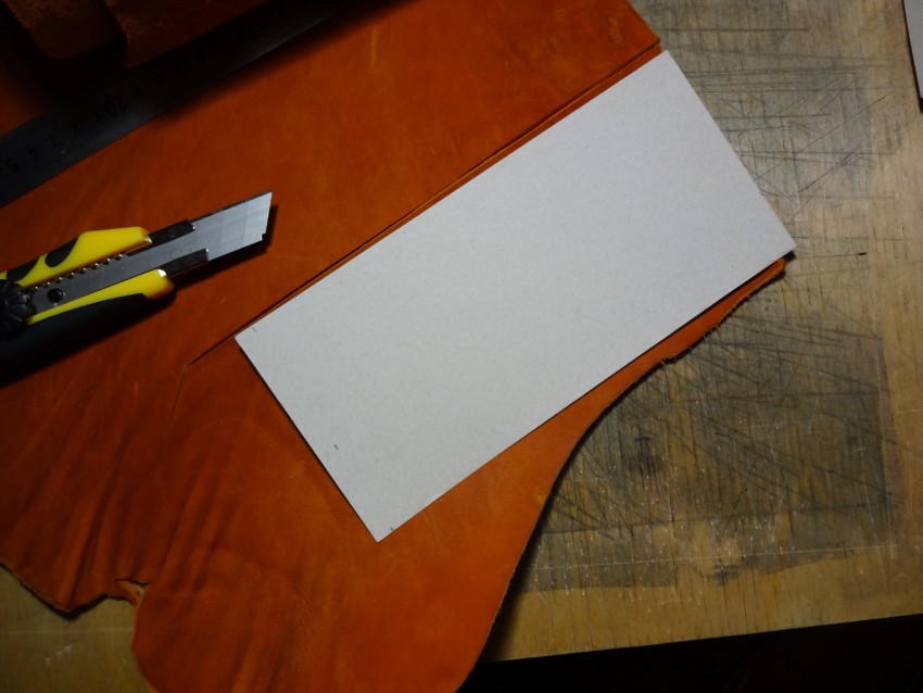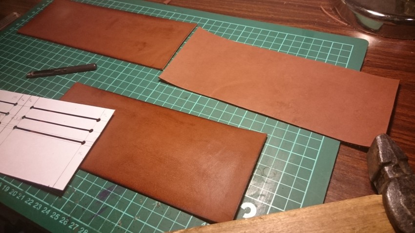 Когда пластина кожи подсохла можно приступать к ее разметке по выкройке, и вырезанию деталей для изготовления кошелька.