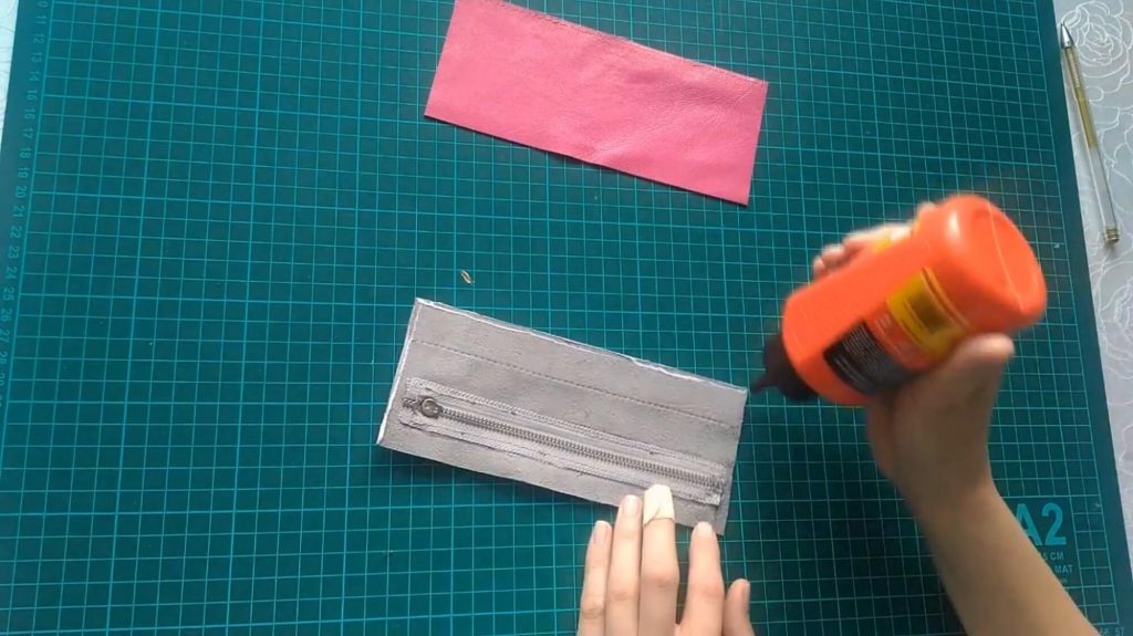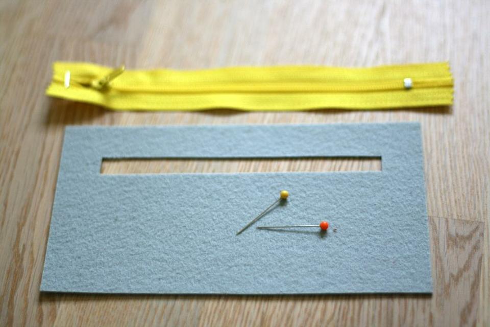 Далее, берём серую деталь 8 см., намечаем и вырезаем “окошко” для молнии. Наносим клей по краям “окошка” с изнанки. Приклеиваем, прошиваем рамочку на машине.