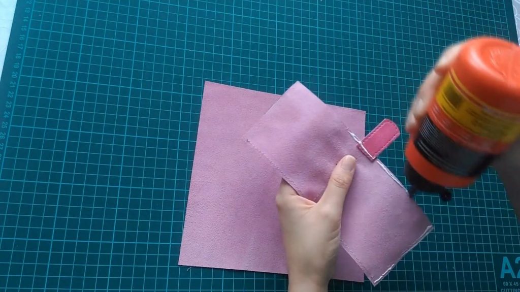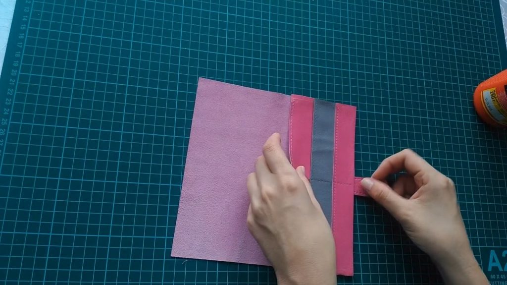 Затем, возьмём 2 розовых детали 4/2 см. и склеим их друг с другом. Затем этот “язычок” приклеим снизу, на серую деталь. Сшить по краешку розовой полоски.
