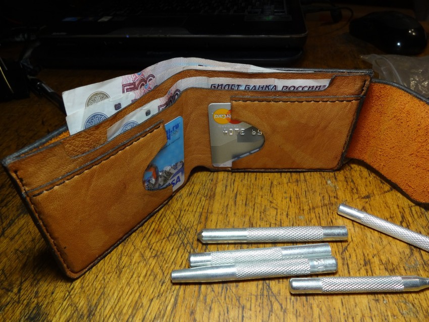 Результат работы меня порадовал, сшитое портмоне имело минимально возможный размер и легко входило в нагрудный карман любой имеющейся рубашки. Купюры и банковские карты входили и извлекались из отделений легко. В один отсек помещалось до 5 карт или визиток.