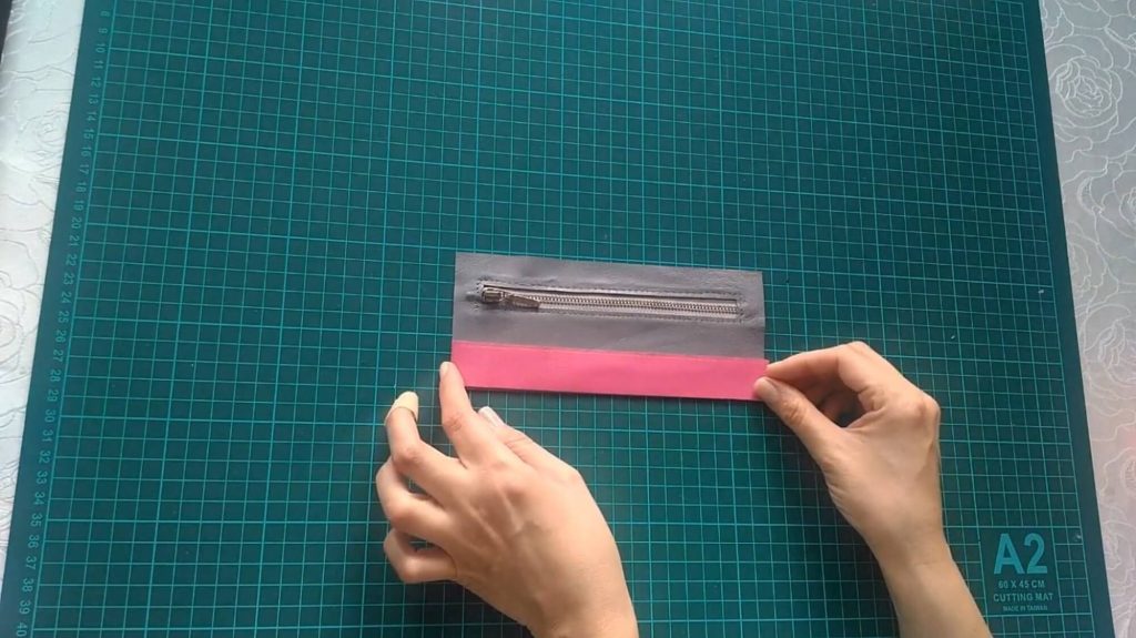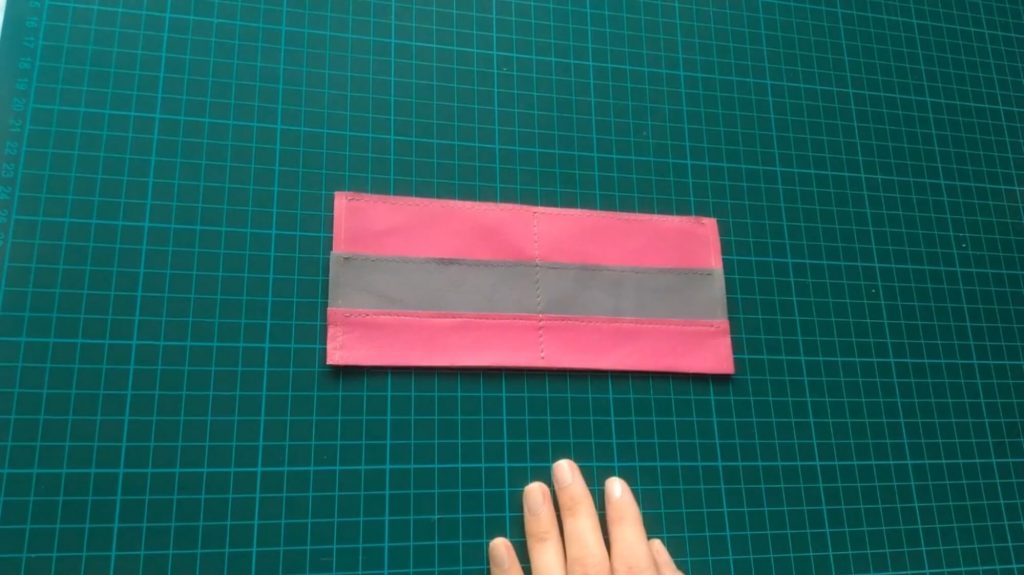 Приклеиваем и, если есть швейная машинка – прошиваем , отступив от среза розовой полоски 3 мм.