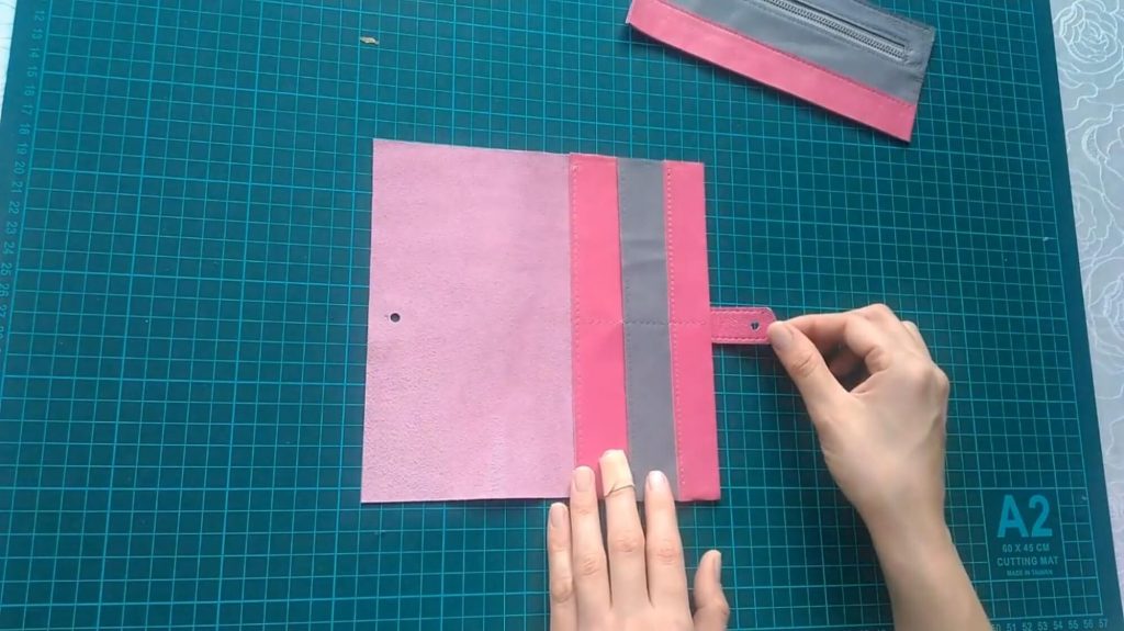 Сложите два изделия вместе так, чтобы у вас получилось два отдела — для мелочи и купюр. Та часть, которая длиннее, будет огибать кошелек и застегиваться на липучку. Пришейте ее к краю.