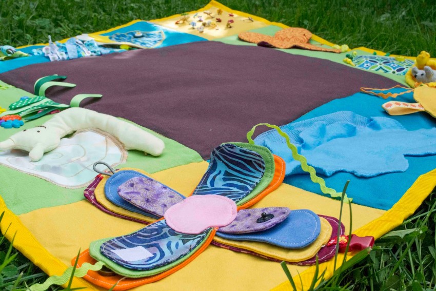 В качестве основного покрытия можно использовать плотную ткань красочной расцветки, к которой следует пришить, либо приклеить в любом порядке различные объемные предметы: