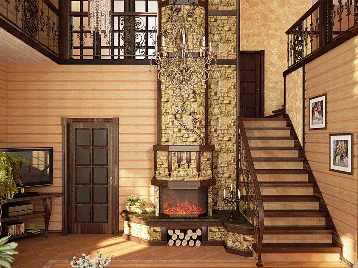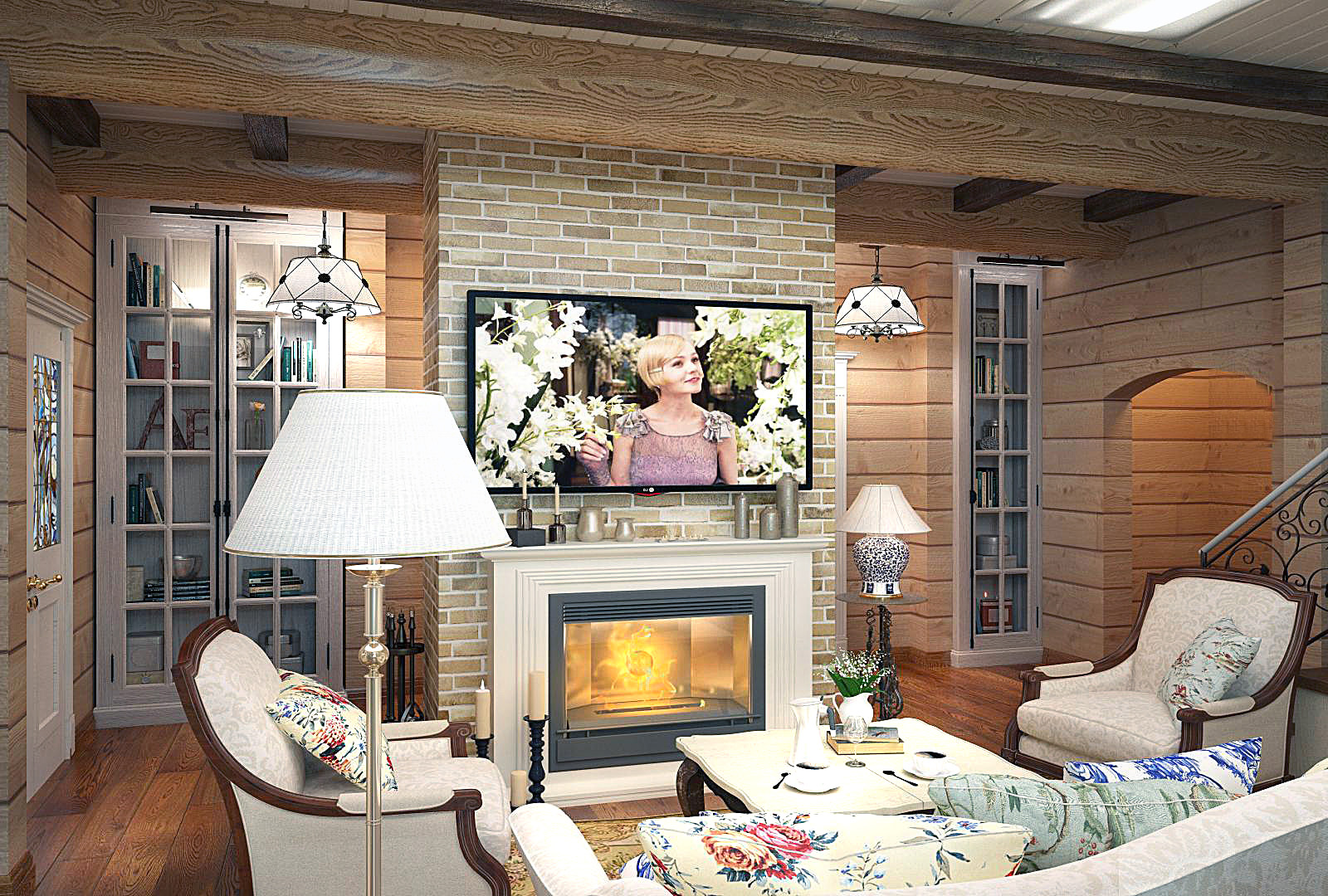 В наше время главное украшение любого дома, что? Правильно, телевизор. А вот для интерьера гостиной в деревянном доме главным украшением будет классический камин. Также гармонично можно использовать различного рода натуральные камни. Например, камин сделанный из гранита и мрамора под цвет дерева добавит вашему дому тепла и уюта. В крайнем случае установите фальш камин.