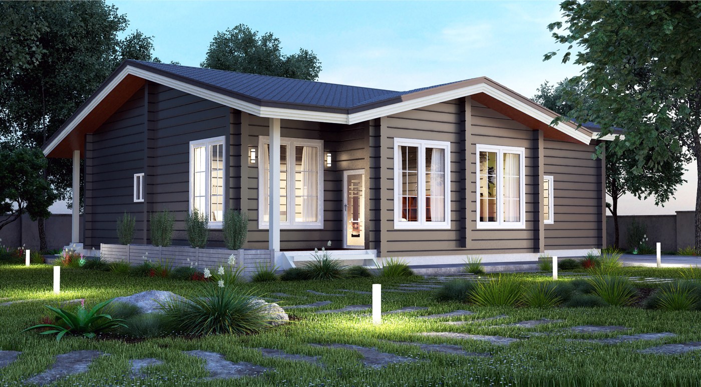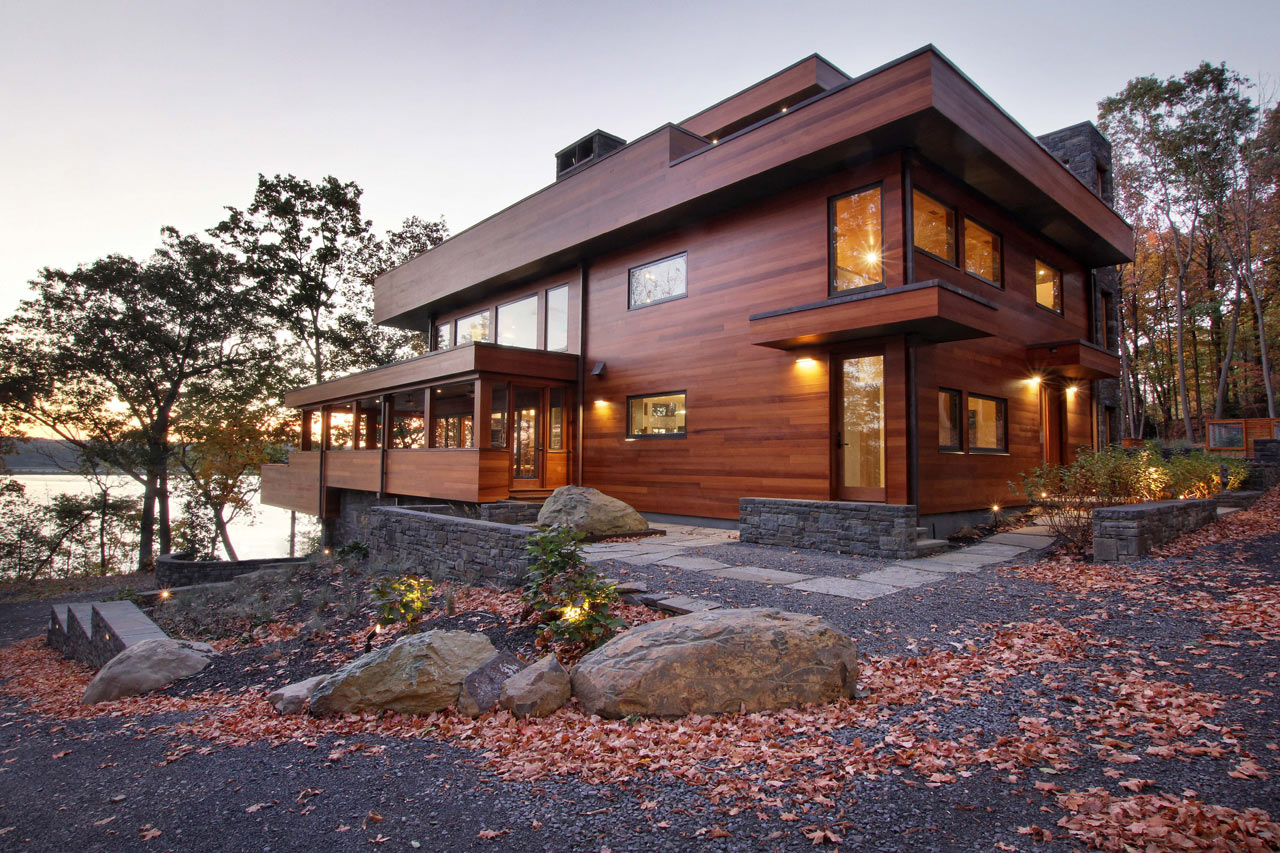 Норвежский. Традиционное норвежское жилье узнается по фасаду тёмного цвета, и стенам из бревна лафетной рубки (утончённого с боков). В норвежских домах ценится простота и минимализм.