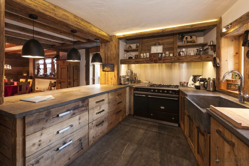 - Мебель для кухни в деревянном доме может быть как классической из дерева, так и современной. Главное, добиться гармоничного сочетания в интерьере.