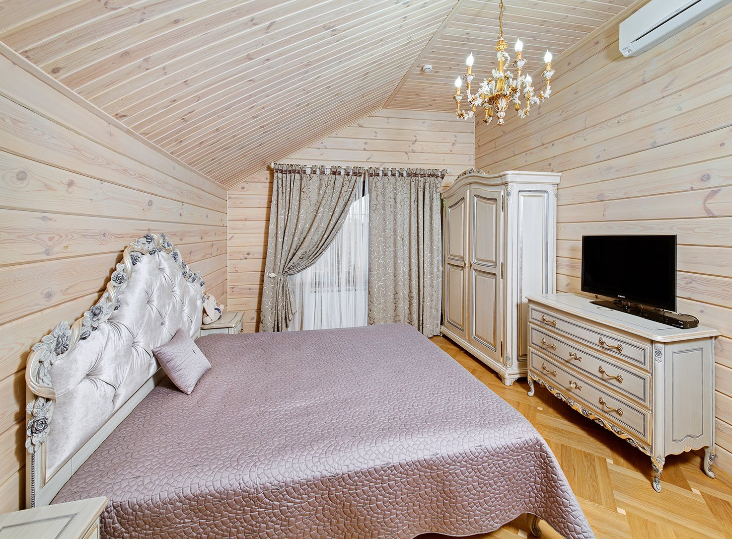 Но никто не заставляет вас довольствоваться деревянными поверхностями стен и потолка. Все можно спрятать и оформить интерьер в любом, понравившемся вам стиле. Сделайте светлую спальню в пастельный тонах, если это вам по-вкусу.
