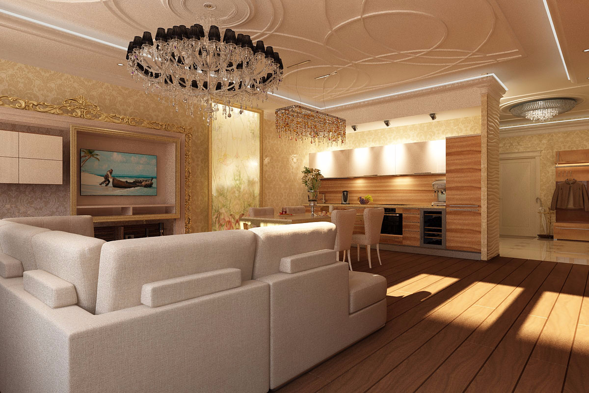 Пол в гостиной может быть из досок, отполированных, пропитанных морилками и покрытых лаком. Также, в качестве напольного покрытия можно использовать ламинат с деревянной или каменной текстурой, кафельную плитку или ковровое покрытие.