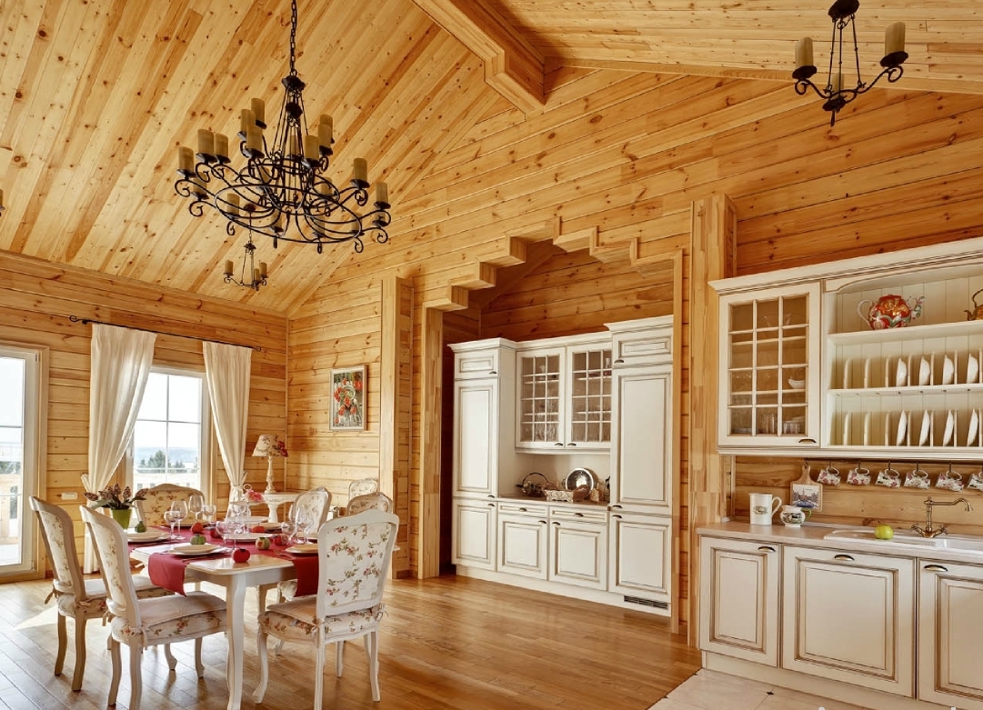 Если вы еще не определились, каким хотите видеть интерьер вашего деревянного дома, стоит посмотреть фотографии готовых интерьеров гостиных, кухонь и спален.