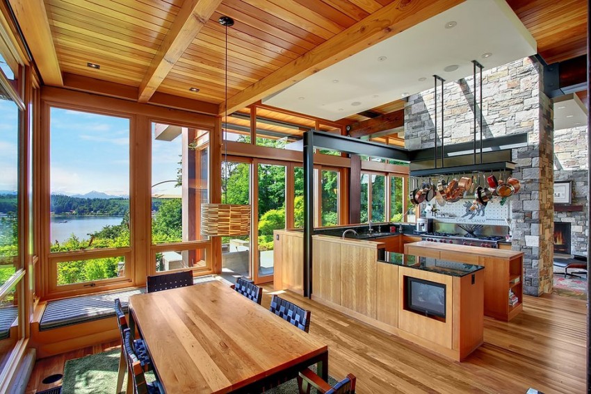 При планировании интерьера кухни в деревянном доме нужно учитывать несколько моментов:
