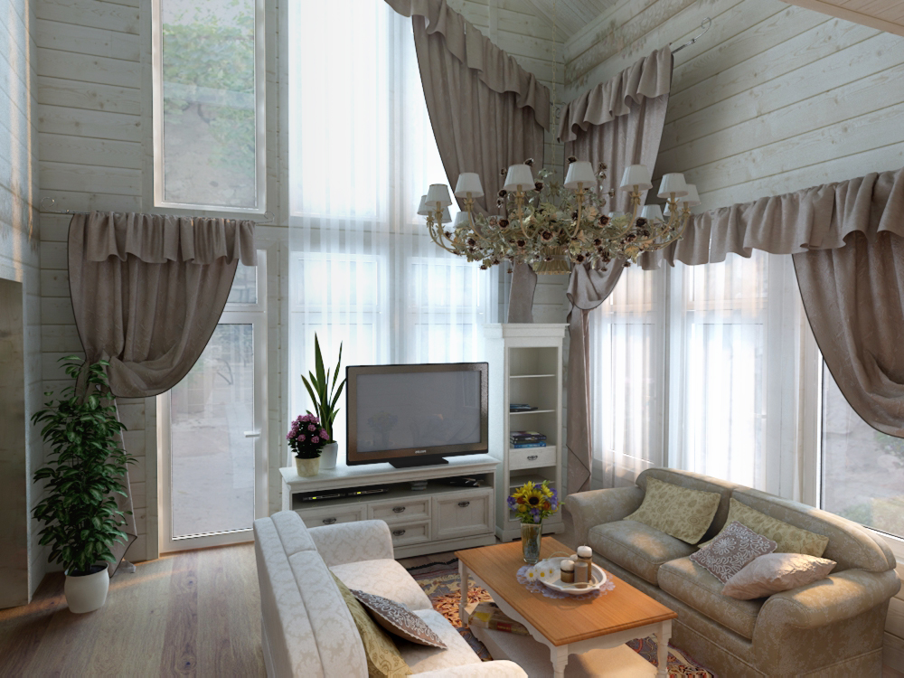Для просторного частного дома с панорамными окнами и высокими потолками, расположенного в ближайшем пригороде или коттеджном поселке, хорошо подойдет современный интерьер в доме из бруса, выполненный в классическом французском стиле Прованс.