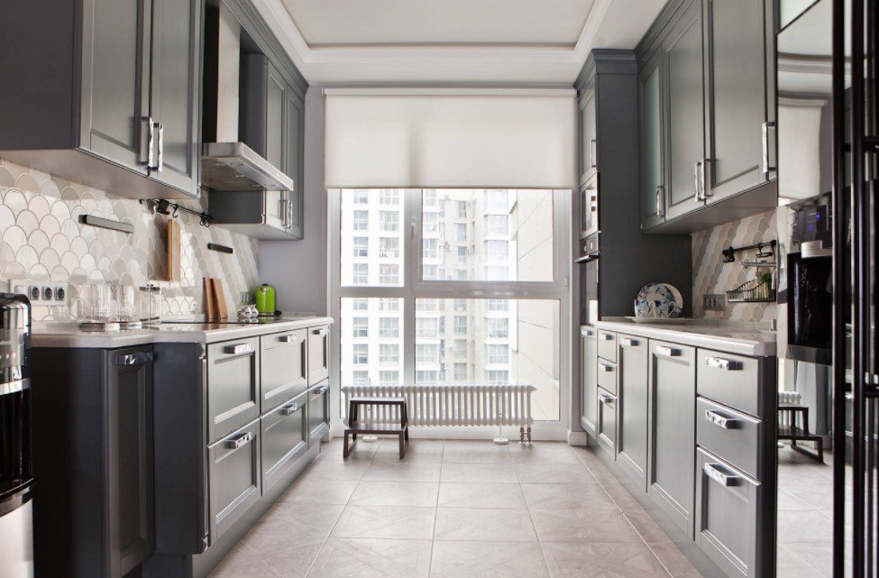 Существует вариант создания параллельного ленточного остекления, при котором не нужно будет жертвовать верхним ярусом кухонных систем хранения. Безусловно, такой вариант обогащения кухни естественным светом подходит для помещений с достаточно высокими полками.