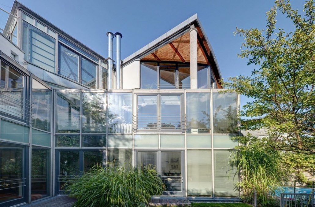 Огромные панорамные окна являются визитной карточкой коттеджей их стекла и бетона. Иногда они занимают всю стену. На крышах устанавливаются ветряные электроустановки, солнечные батареи, системы для сбора дождевой воды. Плоская поверхность крыши оборудуется под место для занятий спортом или под зону отдыха.