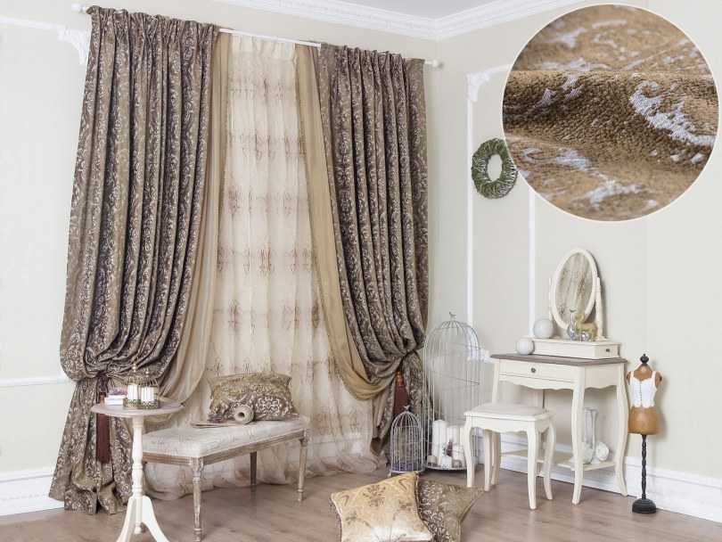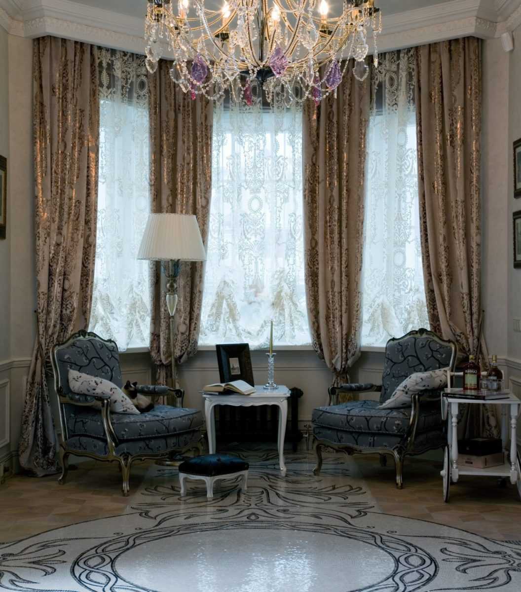 | классика | в тон интерьеру, гармонирующая с обивкой мебели | тяжёлая портьерная и прозрачная органза, вуаль |
