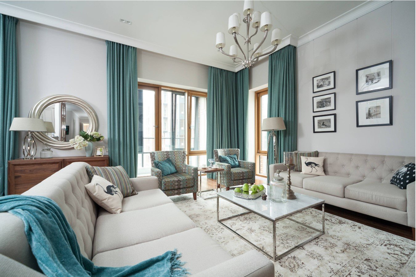 Классические шторы простой формы отлично смотрятся в современной гостиной