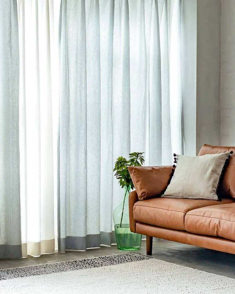 Чтобы дополнить плотную стену из натуральной ткани, можно выбрать полупрозрачные занавески их натуральных материалов
