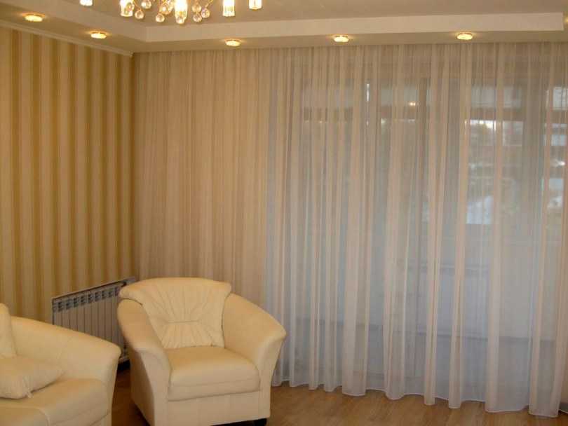 Наличие в комнате окон в пол. С такими окнами можно любоваться видами из окон. Тюль будет очень выигрышно смотреться на таком фоне, создавая мерцающий эффект. Особенно красиво будет это выглядеть если в комнате есть балкон.