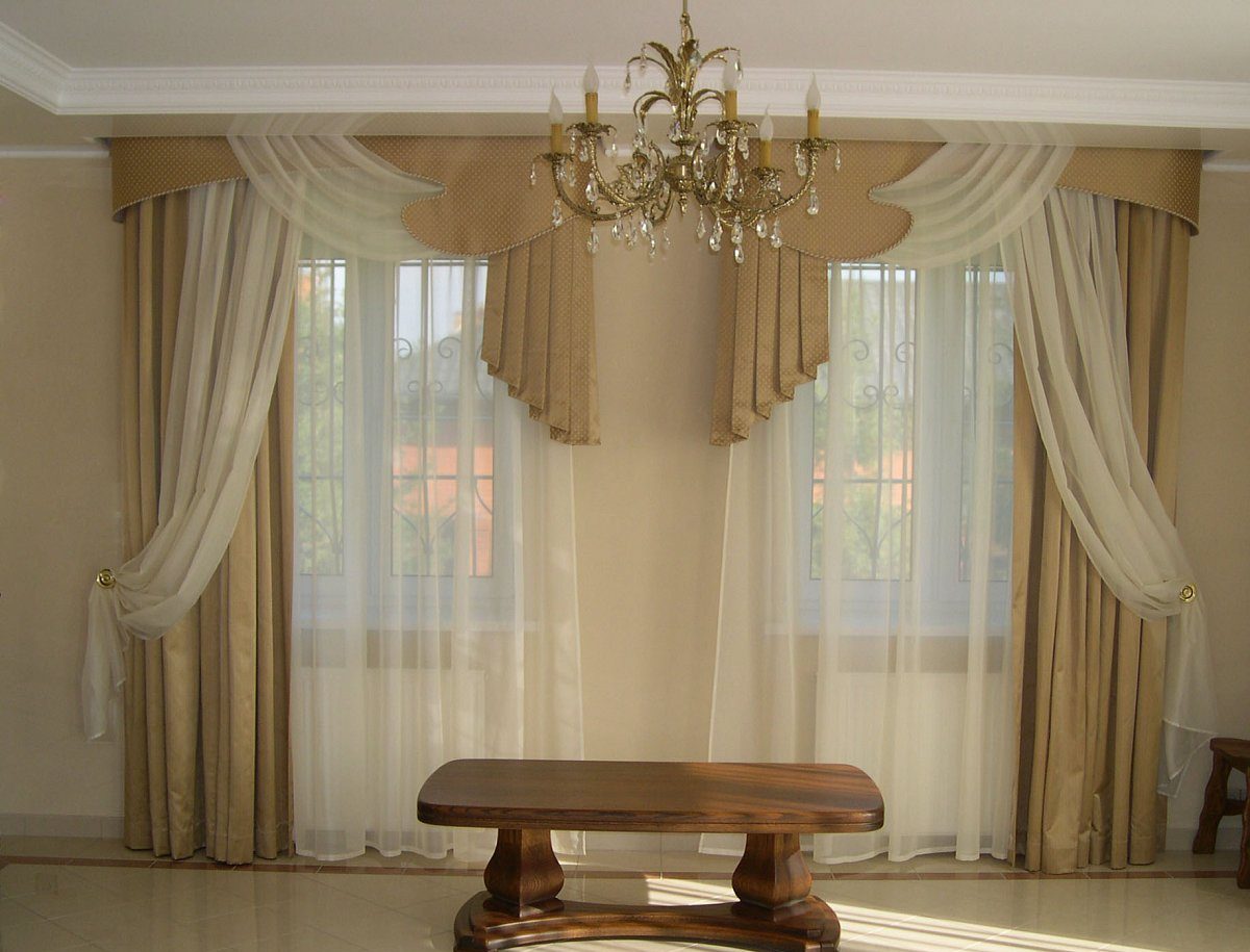 На фото пример комбинации кисеи и классических штор в интерьере зала.
