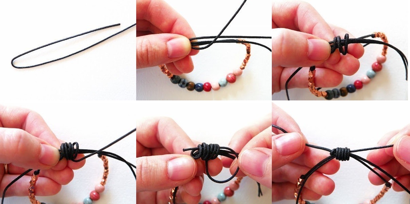 - Продолжайте шить, пока не будет сформирована нужная длина браслета. Теперь отрежьте один из свободных кончиков шнура, а на второй привяжите бусину или наденьте подвеску. Конец пришейте, чтобы застежка не потерялась.