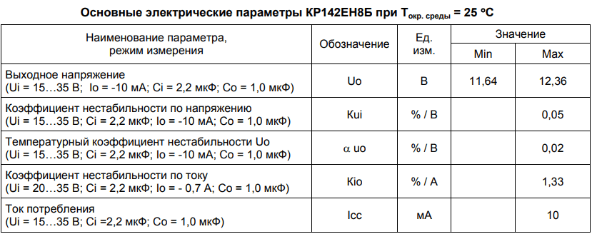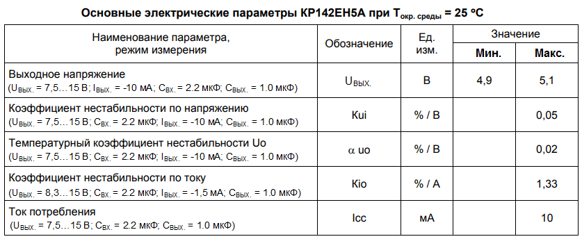 Кроме максимально допустимых значений у КР142ЕН5А есть электрические параметры. Они приводятся совместно с дополнительными условиями их измерения. Все значения в этом перечне справедливы только при условии температуры окружающей среды ТОКР. = + 25ОС.