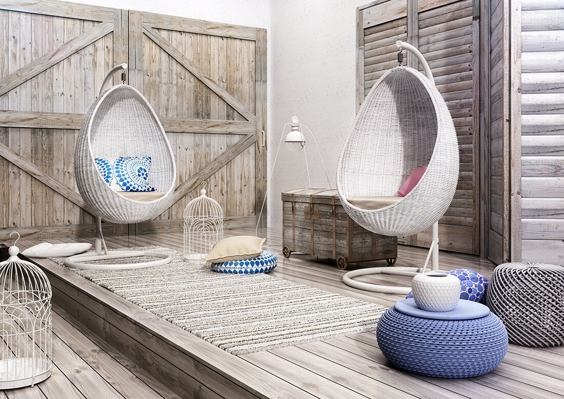 Различают также и подвесные детали. Прежде всего они делятся на мягкие и твердые разновидности. Твердые обычно имеют жесткую основу, вокруг которой оплетается ротанг или лоза. Для удобства на сиденья выкладываются подушки или пледы. Обычно жесткие плетеные конструкции используются вместо классических кресел, стульев или кресел качалок.