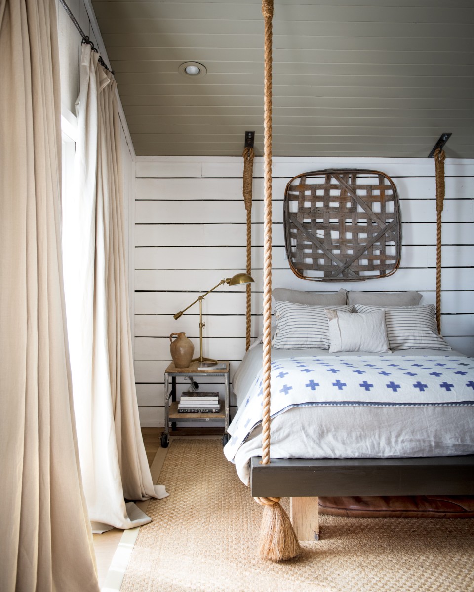- Потолочные. В потолок или в балки монтируются анкерные петли, а к ним уже тросы, канаты, цепи или другие прочные элементы, которые смогут выдержать нагрузку и не оборваться. Бывает к ним еще добавляют специальные лифты, с помощью которых кровать можно поднять к потолку и освободить место в комнате. Днем кровать сливается с потолком, а ночью выполняет свою стандартную функцию спального места. Такие кровати напоминают садовые качели внутри дома.