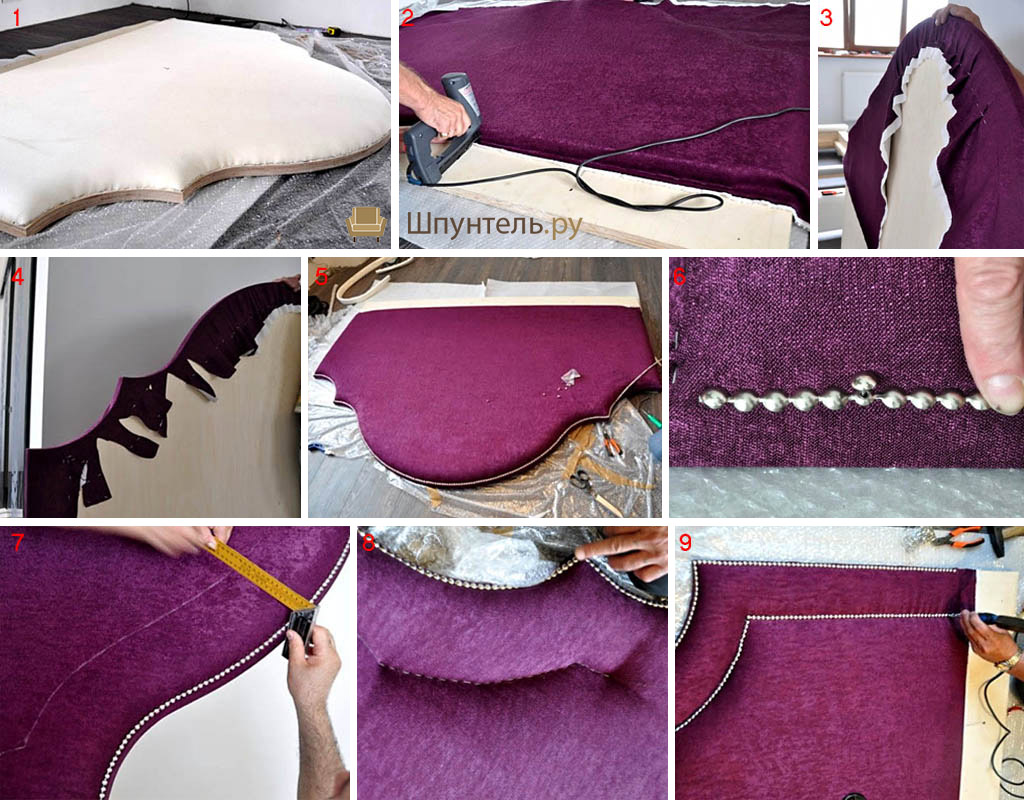 Из поролона или пенополистирола вырезается совпадающая по форме и габаритам заготовка. Она прикладывается к деревянному изделию, выполняется несколько отверстий для декоративных пуговиц. Осуществляется раскрой ватина и обивочной ткани по параметрам заготовки с припуском, размер которого должен быть равен сумме толщины всех слоев, умноженной на два.