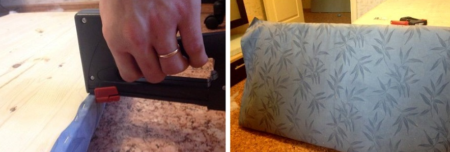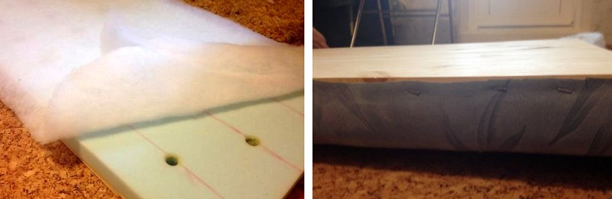 Поролон приклеивается к деревянной основе. На заготовку натягивается ватин, припущенные края которого фиксируются мебельным степлером. Количество скоб может быть неограниченным, поскольку они все равно будут невидимыми. Операция повторяется с обивкой.