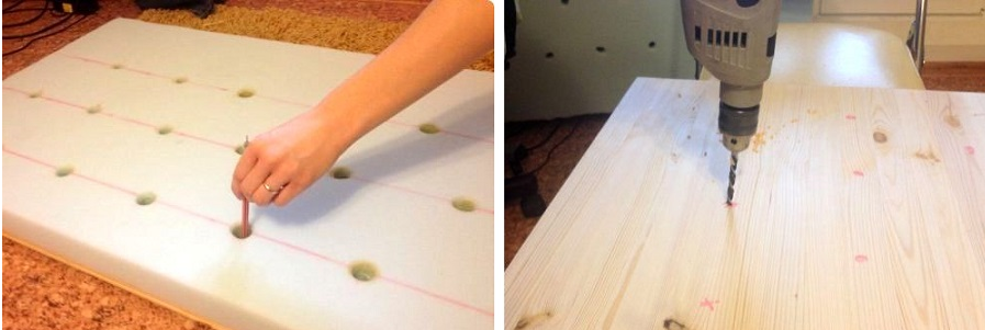 Очередность изготовления элементов для будущего ложа включает в себя раскрой материалов, их шлифовку, сверление отверстий для вкручивания саморезов под углом и скрепление элементов мебели при помощи столярного клея и саморезов.