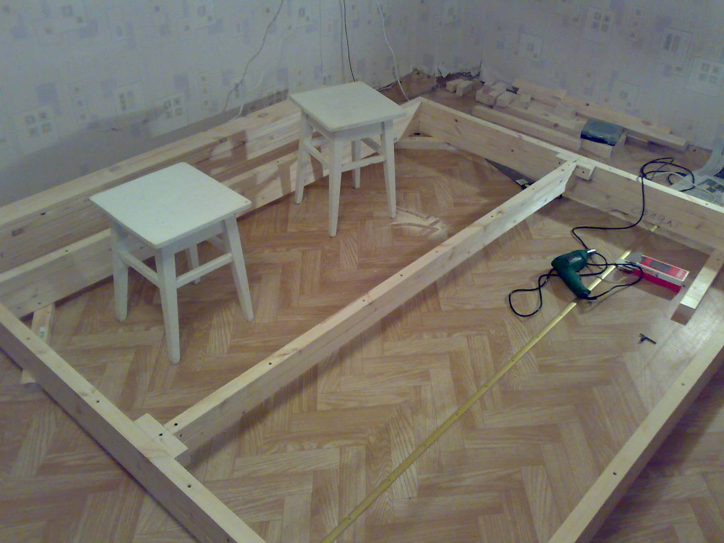 - Сначала собирается каркас кровати, так как он не будет виден. Огрехи на нем также не будут на глазах. Здесь можно будет овладеть искусством работы с деревом.
