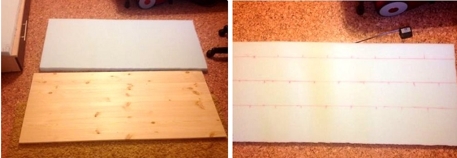 Из фанеры выпиливается основа размером 45х180 см. С ребер следует снять фаску, а затем тщательно обработать края, чтобы не повредить ватин и обивку.