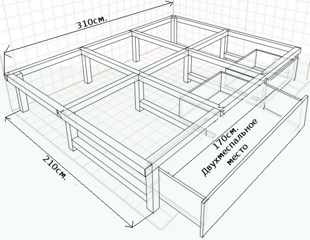 При расчете размеров будущей конструкции, учитывается, сколько человек будет спать на ней, их рост, вес, наличие свободного места в комнате. Для детской или подростковой кровати размер конструкции делается 70 на 160 см., для взрослого – 80 на 190 см., для двоих – 150 на 200 см., «королевский» вариант – 220 на 240 см. Для особо «тучных» жильцов, весом от 150 кг., каркас потребует дополнительного укрепления.