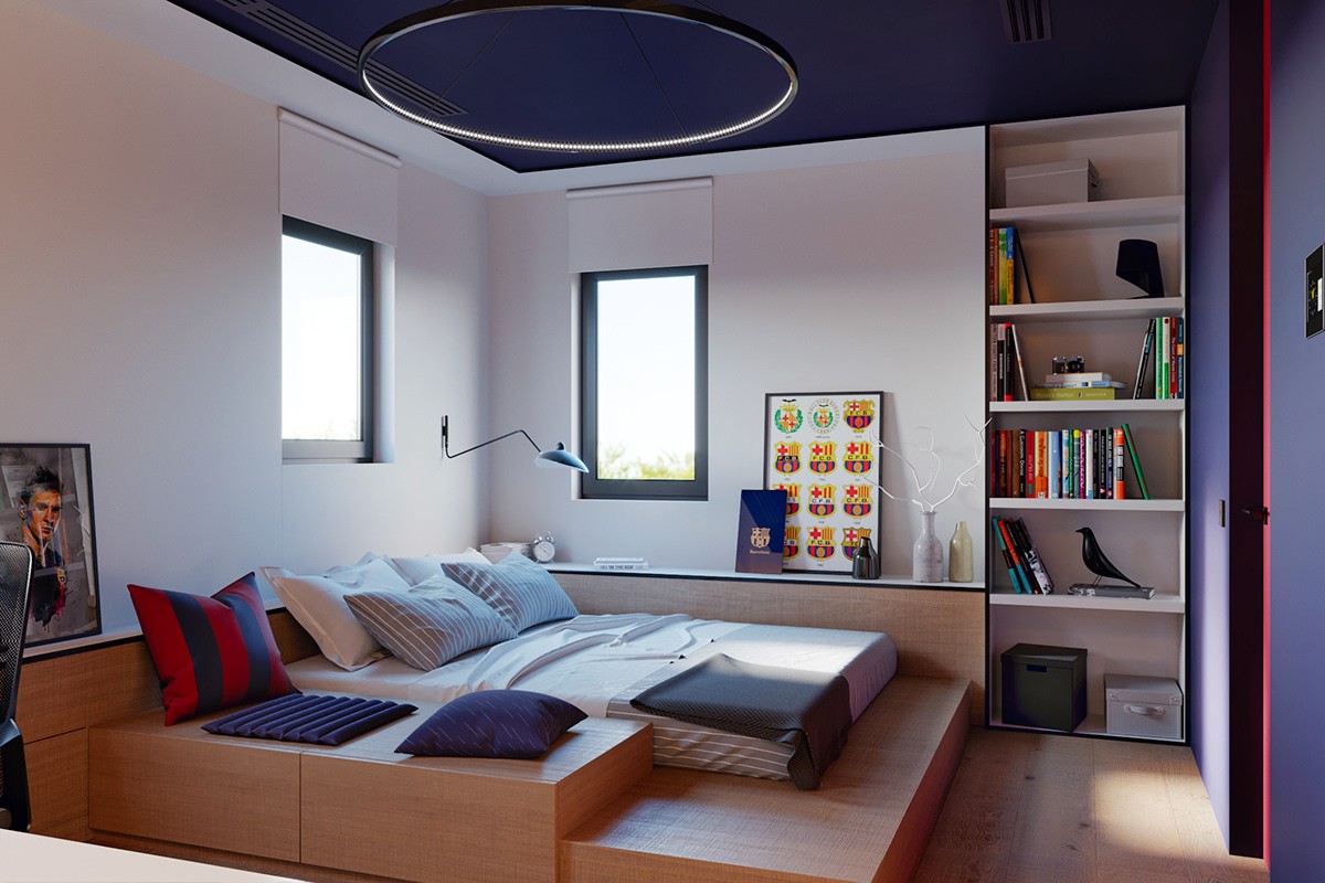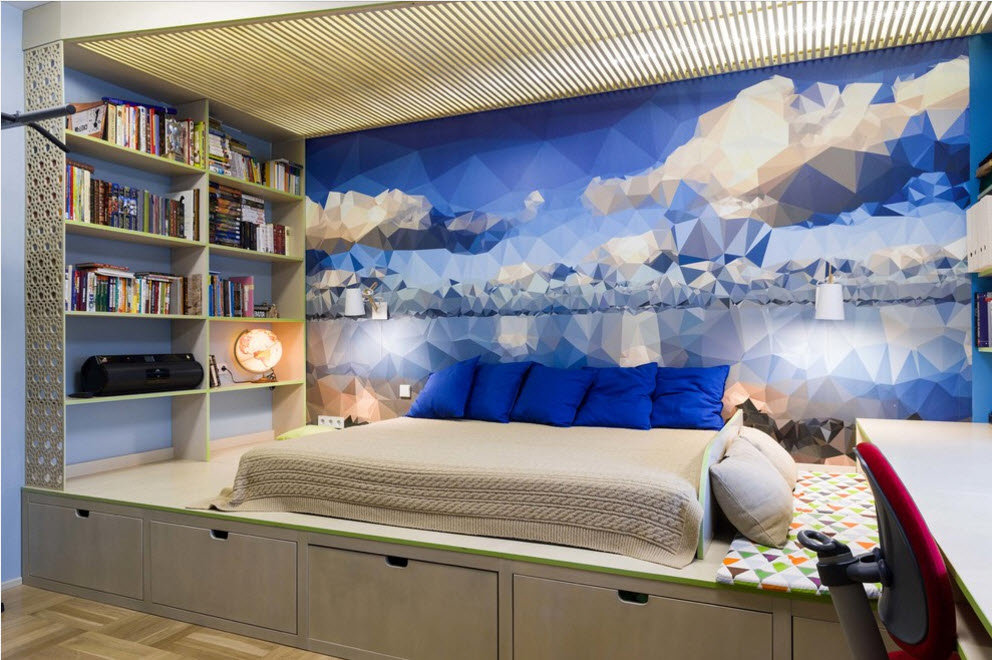 Функциональная кровать на подиуме будет идеальным решением для комнат с нестандартной планировкой. Отказ от использования мебельных гарнитуров позволит «разгрузить» такие помещения. В детских комнатах можно установить также двухъярусные кровати на возвышении. Встроенные ящики детишки будут использовать для хранения игрушек, одежды и постельного белья.