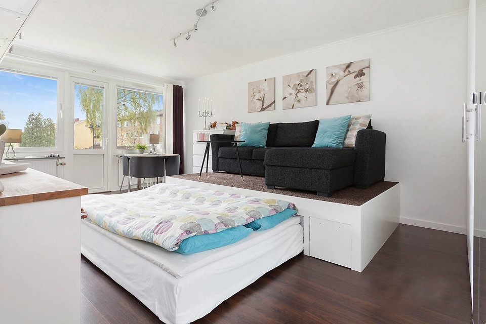 - Затраты на конструкцию. Обустройство возвышения в интерьере — это дополнительные затраты времени, сил, средств. А если планируется встроить систему хранения и/или выдвижное спальное место, расходы возрастут еще больше. Даже несмотря на то, что этот элемент дизайна вполне реально сделать самостоятельно, своими руками, затраты на конструкцию все равно будут ощутимыми. Хотя, конечно, выйдет более бюджетно, чем готовый вариант или сделанный на заказ.