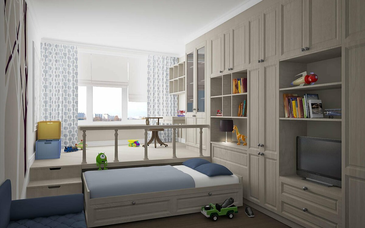 При меблировке детских комнат также стало популярным устройство спального места на подиуме или монтаж кровати выдвижного типа. Особенно актуально это в маленьких комнатах, где подиум позволяет максимально рационально распределить всю необходимую мебель, не загромоздив при этом пространство.