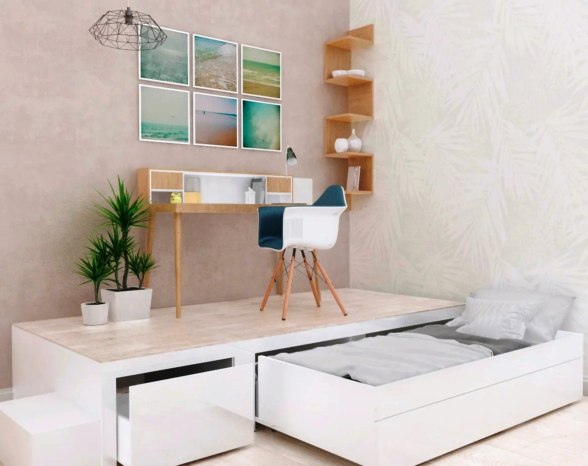 При этом выдвижная кровать-подиум отличается привлекательным внешним видом и позволяет корректировать само пространство помещений. С его помощью можно создать дополнительные места для хранения и разумно организовать комнату.