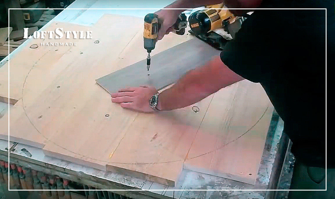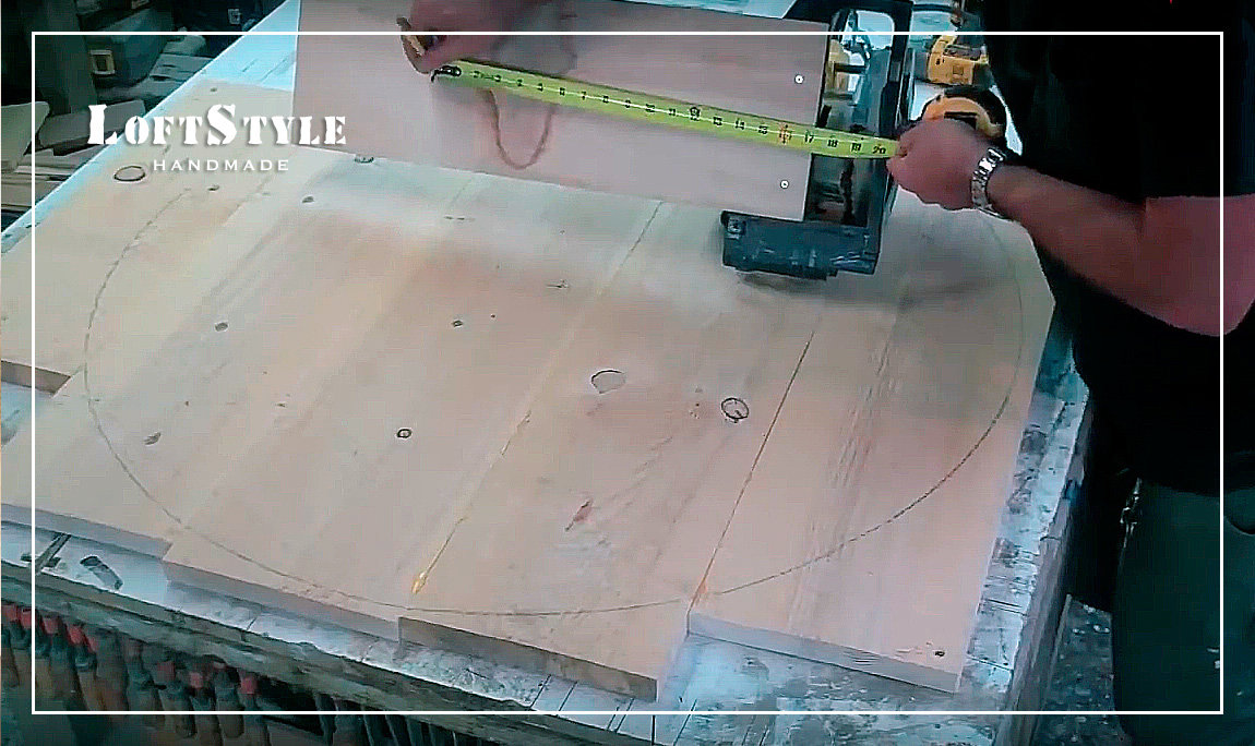 Далее формируются столешница и поперечные перекладины. Диаметр этих деталей зависит от габаритов стандартной заготовки. Длина стороны обычной фанера составляет 1,5 м. Поэтому внешний диаметр опорного элемента составит 128 см, а внутренний — 104 см. Ножки устанавливаются плоской частью внутрь. Соответственно, габариты планки будут 12х106 см.