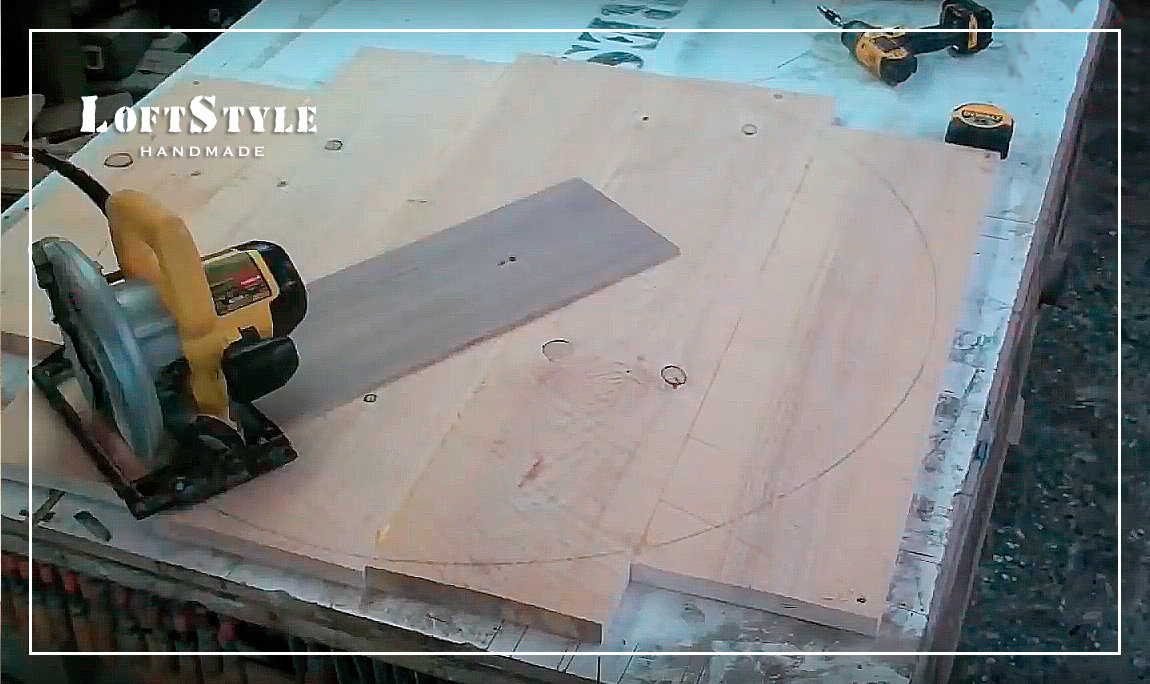 - Сначала выложите доски и разрежьте на торцовочной пиле.