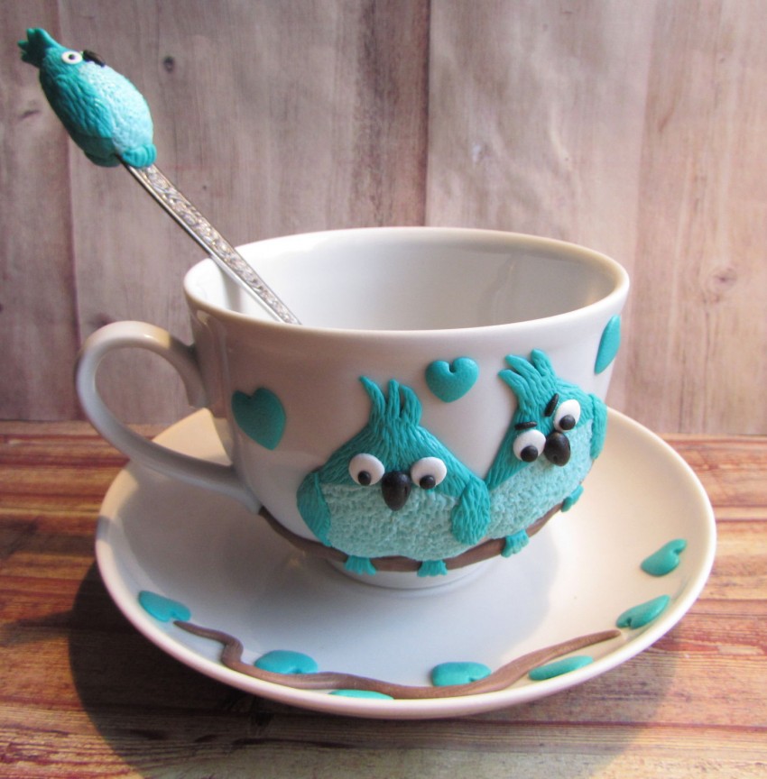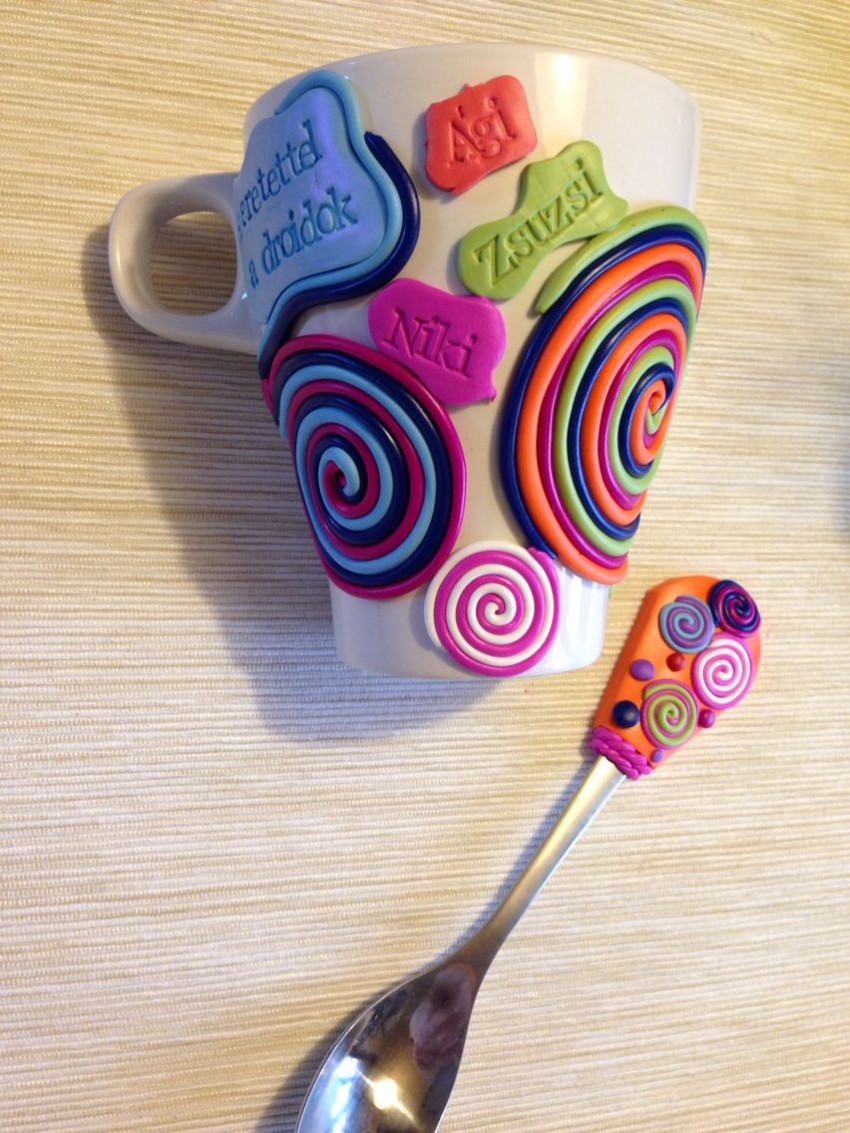 Целую линию полимера предлагает фирма «Полиформ Продактс». Но этот материал выбирают, как правило, скульпторы. Помимо твердой все вышеперечисленные фирмы производят пластику жидкую, представляющую собой гель. Это тягучий прозрачный материал, затвердевающий после проведенной температурной обработки. Декор кружек и ложек полимерной глиной может быть выполнен и с помощью геля, возможности которого также безграничны. Перед тем как купить этот удивительный материал, следует выбрать изделие, которое и будет украшаться. Исходя из его цвета, нужно будет определиться с тоном пластики. Пусть для начала их будет два или три. Среди них должен быть брусок белого цвета, которым можно будет разбавлять более насыщенные краски.