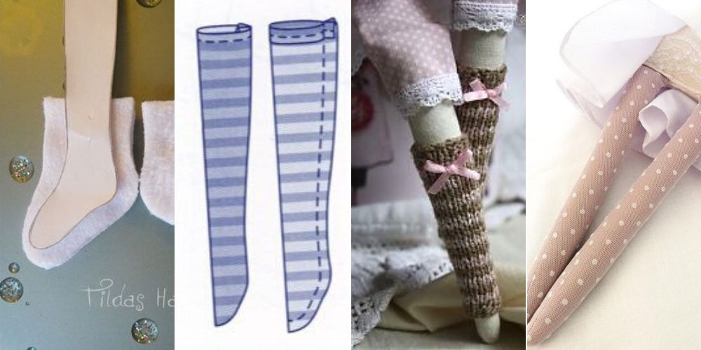 Чаще всего на ноги текстильным куклам одевают миниатюрные носки. Их можно сшить из кусочка стрейчевой ткани прямоугольной формы. В качестве альтернативы подойдут полусапожки из тонкого войлока, чулки или вязаные гетры.
