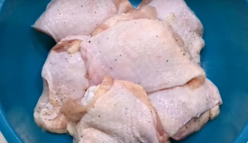 1. Куриные окорочка поперчите и посолите. Поставьте в холодильник мариноваться на 12 часов. Чем дольше мясо лежит в маринаде, тем лучше. Я вообще мариную с вечера.